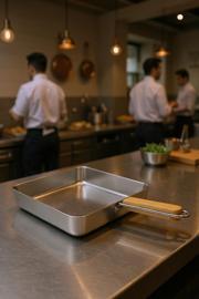 Bambum Cesta kare sunum tavası, bambu saplı çelik tava, şık yemek sunum tavası, kare servis tabağı, modern çelik sunum ürünleri, bambu saplı servis tavası, restoran tipi sunum tavası