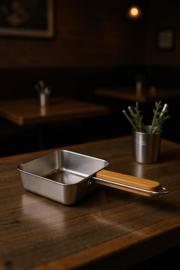 Bambum Cesta küçük kare sunum tavası, bambu saplı çelik tava, şık sunum tavası küçük, kare servis tabağı, modern çelik sunum ürünleri, bambu saplı küçük sunum tavası, restoran tipi mini sunum tavası