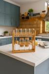bambum layla mutfak seti, 12 parça mutfak seti, bambu kapaklı kavanoz seti, baharatlık ve yağdanlık seti, standlı mutfak düzenleyici, cam kavanoz seti, şık mutfak aksesuarı, bambu mutfak ürünleri
