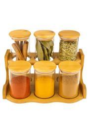 Bambum Loca - 6 Parça 2 Katlı Bambu Baharatlık Seti | Cam Kavanozlu Baharat Standı