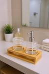 Zarif ve Bütünsel Tasarım: Bambu standı, sabunlukları bir arada tutarak lavabo kenarında dağınık bir görünümü engeller ve sofistike bir atmosfer yaratır.