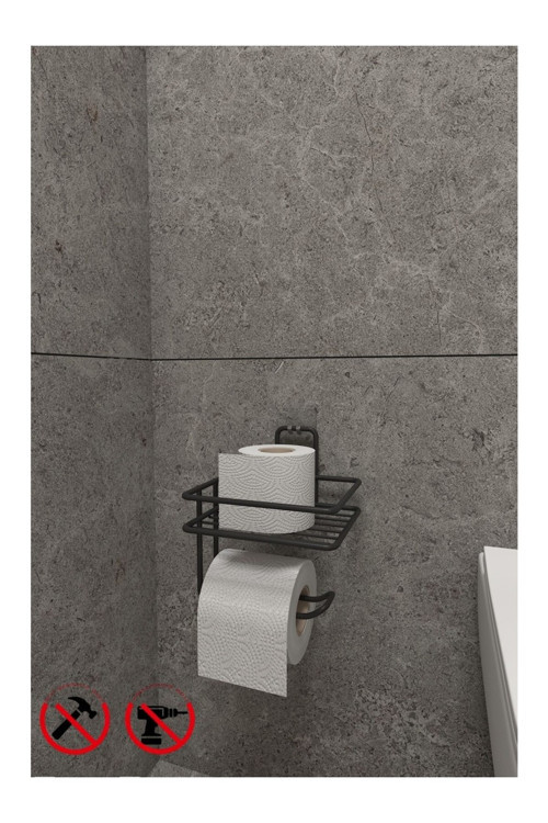Siyah Güçlü Yapışkanlı Yedek Raflı Tuvalet Kağıtlık Banyo Düzenleyici