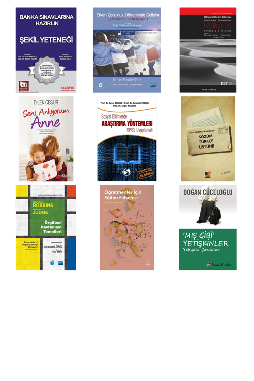 Banka Sınavlarına Hazırlık - Şekil Yeteneği - Erken Çocukluk Döneminde Gelişim - Kalkülüs Eksiksiz Bir Ders - Seni Anlıyorum Anne - Sosyal Bilimlerde Araştırma Yöntemleri - SPSS Uygulamalı - Sözüm Türkçe Üstüne - Örgütsel Davranışın Temelleri - Öğretmenler İçin Eğitim Felsefesi - ‘Mış Gibi’ Yetişkinler