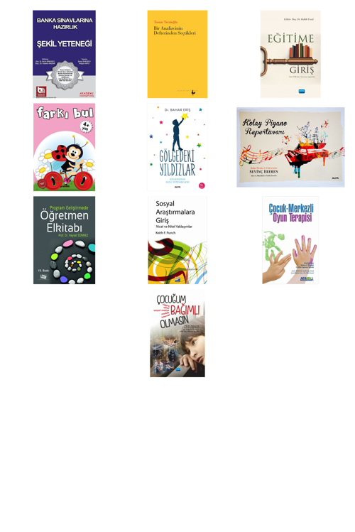 Banka Sınavlarına Hazırlık - Şekil Yeteneği - Bir Analizcinin Defterinden Seçtikleri - Eğitime Giriş - Farkı Bul - Gölgedeki Yıldızlar - Kolay Piyano Repertuvarı - Program Geliştirmede Öğretmen El Kitabı - Sosyal Araştırmalara Giriş - Çocuk Merkezli Oyun Terapisi - Çocuğum Bağımlı Olmasın