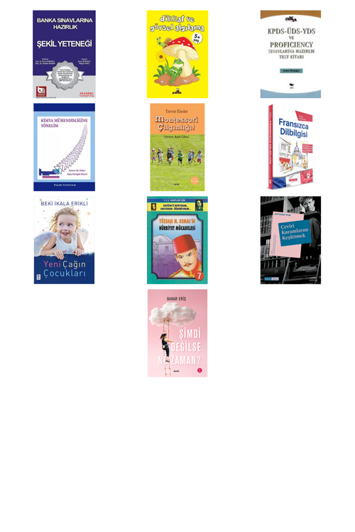 Banka Sınavlarına Hazırlık - Şekil Yeteneği - Dikkat ve Görsel Algılama - Kpds - Üds - Yds ve Proficiency Sınavlarına Hazırlık Test Kitabı - KİMYA MÜHENSİDLİĞİNE YÖNELİM - Montessori Çılgınlığı! - Türkçe Açıklamalı Fransızca DilBilgisi - Yeni Çağın Çocukları - Yüzbaşı M. Kemal'in Hürriyet Mücadelesi (Eğik El Yazısı) - Çeviri Kuramlarını Keşfetmek - Şimdi Değilse Ne Zaman?