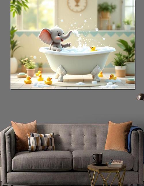 Karizmart Banyoda Eğlenen Fil Dekoratif Kanvas - Mdf Ahşap Tablo