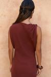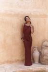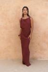 Kolsuz, yuvarlak yaka uzun keten elbise. Düz kesimli ve astarsız. Yan yırtmaç detaylı.