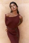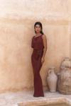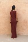 Kolsuz, yuvarlak yaka uzun keten elbise. Düz kesimli ve astarsız. Yan yırtmaç detaylı.