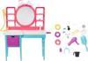 Bebeğin başını lavaboya doğru eğip 'fön makinesini' soğuk suyla kullandığınızda saçlarının değişir. Kolayca temizlemeniz için su çıkarılıp takılabilir çekmecede toplanır. Aynası, aletleri koymak için rafları, saç yıkama alanı ve sandalyesi bulunan makyaj masası; kuaför salonu oyunlarına ilham verir.