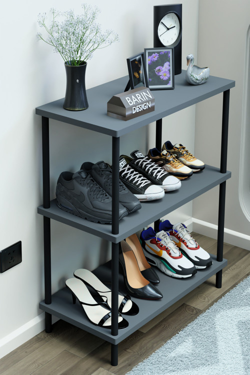 Barın Desıgn tarafından üretilen bu 3 katlı ayakkabılık raf, çevir tak sistemi ile kolay kurulum imkanı sunar.