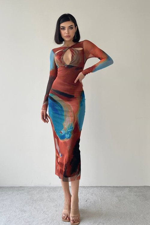 - Batik desenli tül kumaştan üretilmiş, göğüs dekoltesiyle dikkat çeken tasarım midi elbise..