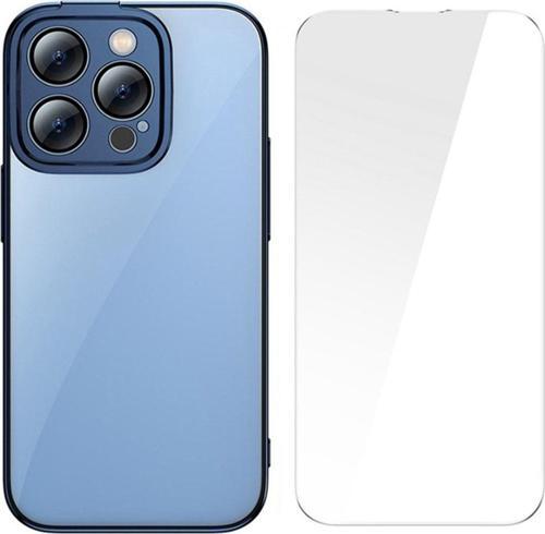Baseus Glitter iPhone 14 Pro Max 6.7 Renkli Kenar Silikon Kılıf + Tempered Ekran Koruyucu Set MAVİ.