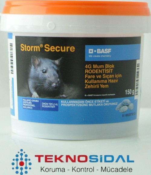 Fare Zehiri Storm Secure 4g Mum Blok 150 gr STORM Secure kullanıma hazır bir preparattır. Tüm istila merkezleri, kaçma yolları, girişleri, yuvalanma ve beslenme merkezleri dikkatlice tespit edilmeli ve hazır yemler bundan sonra kullanılmalıdır. Çocukların ve hedef olmayan canlıların korunması için yemler kiremit, boru gibi malzemelerle örtülmeli yada değişik kap ve kutulara veya fare istasyonlarına koyularak üzerlerine 'Dikkat Fare Zehiri' şeklinde uyarı yazısı yazılmalıdır.