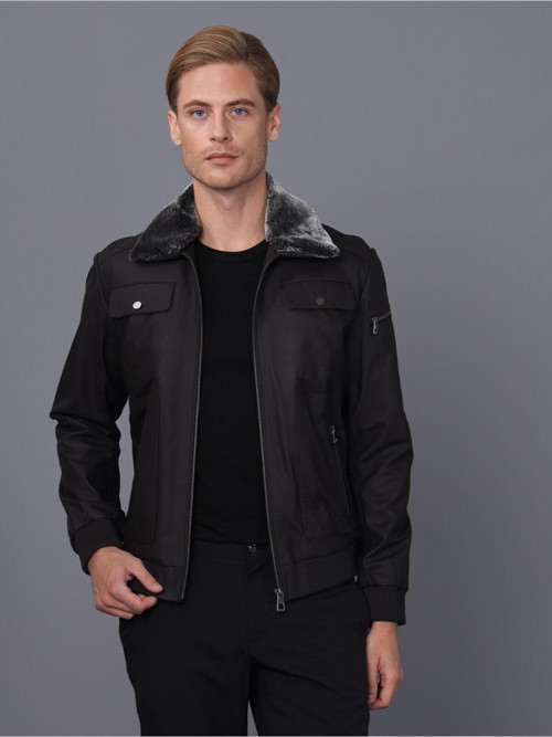 Basics&More Erkek Siyah Deri Ceket Kahverengi - Tafta L