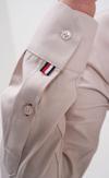 Yakanın iç kısmında kırmızı, lacivert ve beyaz renklerden oluşan şerit detayları bulunur.