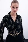 Ön gizli pat, uzun manşetli kol, kalça altı boy, baskılı klasik gömlek.