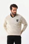 Mzp Kartan Baskılı V Yaka Uzun Kol Dokuma Triko - Bej