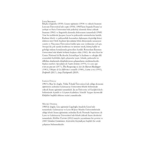 Filozof, psikanalist ve dilbilimci Luce Irigaray bu kitabında dil ve söylem bağlamında Antik Yunan ustalarından günümüze dek kadının unutuluşunu ele alıyor. Başlangıçta hakikate ilham veren dişi iken, ‘usta’ bunu gizli tutar. Böylece dilin evi, bir tür mezara dönüşür. Beslendiği Tanrıçayı, doğayı, kadını unutan erkeğin oluşturduğu ‘bilgelik’ söylemi, insanlığın sürgün edilişi hâline gelir.