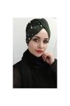 Haki rengiyle zarif bir görünüm kazandırırken, inci detaylarıyla göz alıcı bir dokunuş ekler