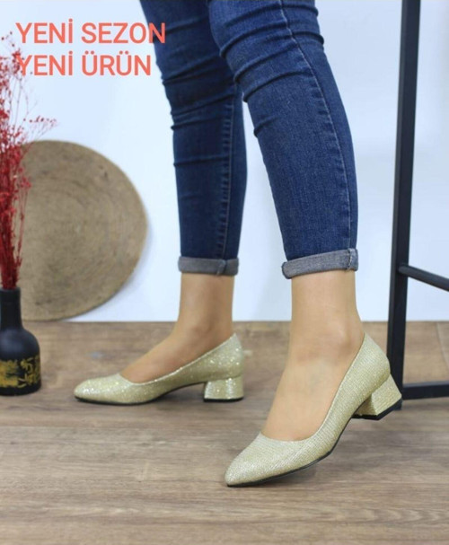 KADIN AYAKKABI GOLD ALTIN SİMLİ SİTİLETTO CUPRA KISA TOPUKLU KLASİK GÜNLÜK AYAKKABI 3 CM