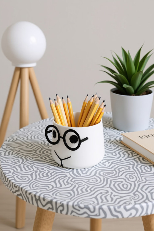 - Gözlüklü profesör kalemlik, hem kalem hem de gözlük için ayrı bölmeleriyle düzenli bir çalışma alanı sağlar.