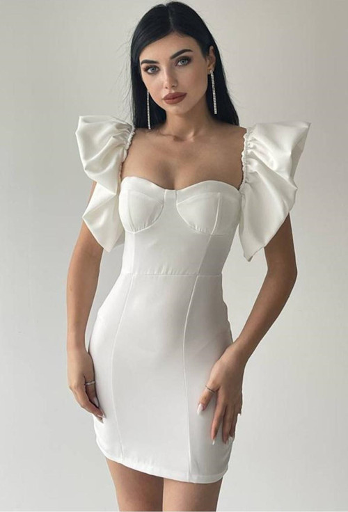 Bayansepeti Atlas Kumaş Sırt Dekolteli Kolları ıki şekilde Kullanılabilen Göğüs Dolgulu Kısa Beyaz Elbise 163