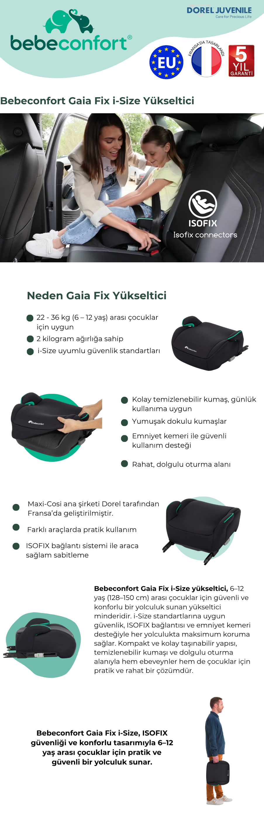Gaia i-Fix yükseltici minder ile her yolculuğu bir üst seviyeye taşıyın. Küçük çocuğunuz için mükemmel bir araba arkadaşıdır ve 6 ila 12 yaş (128–150 cm) arasında rahat, güvenli ve yastıklı bir koltuk sunar. Gaia i-Fix ile küçük çocuğunuz emniyet kemerini takar, rahatça oturur ve her maceraya hazır olur.