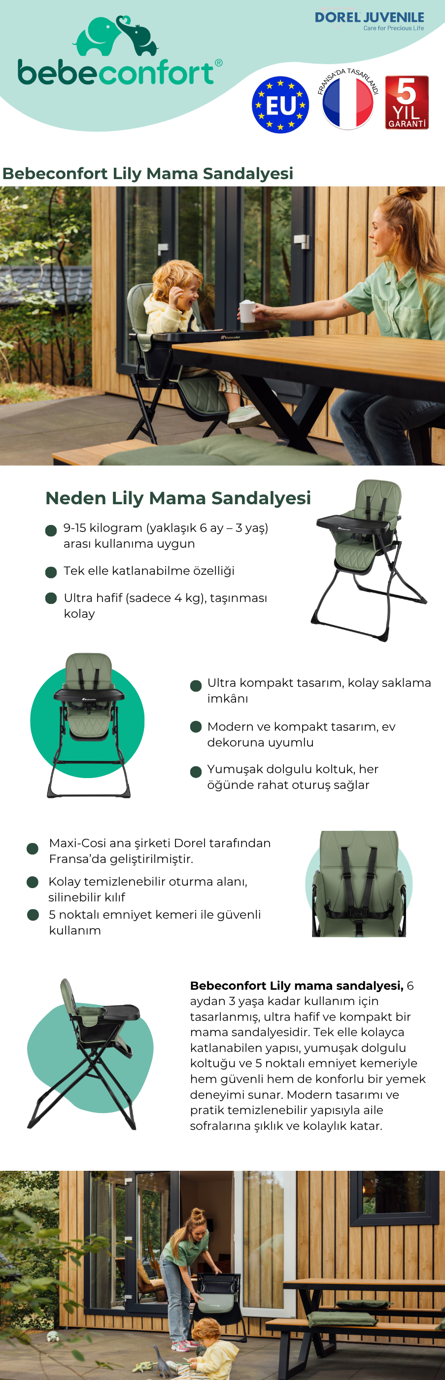 Çocuğunuzun rahat yemek zamanı tahtı Lily ile tanışın. Lily, küçük çocuğunuzun deneyimlediği her ilk lokma ve yeni tat için orada. Kompakt katlanabilir ve tüy kadar hafif tasarımıyla Lily, yaşam tarzınıza uyum sağlar, böylece kolayca saklayabilir veya yanınızda götürebilirsiniz. Neden konfor, stil ve rahatlık arasında seçim yapasınız ki? Lily ile hepsine sahip olabilirsiniz.