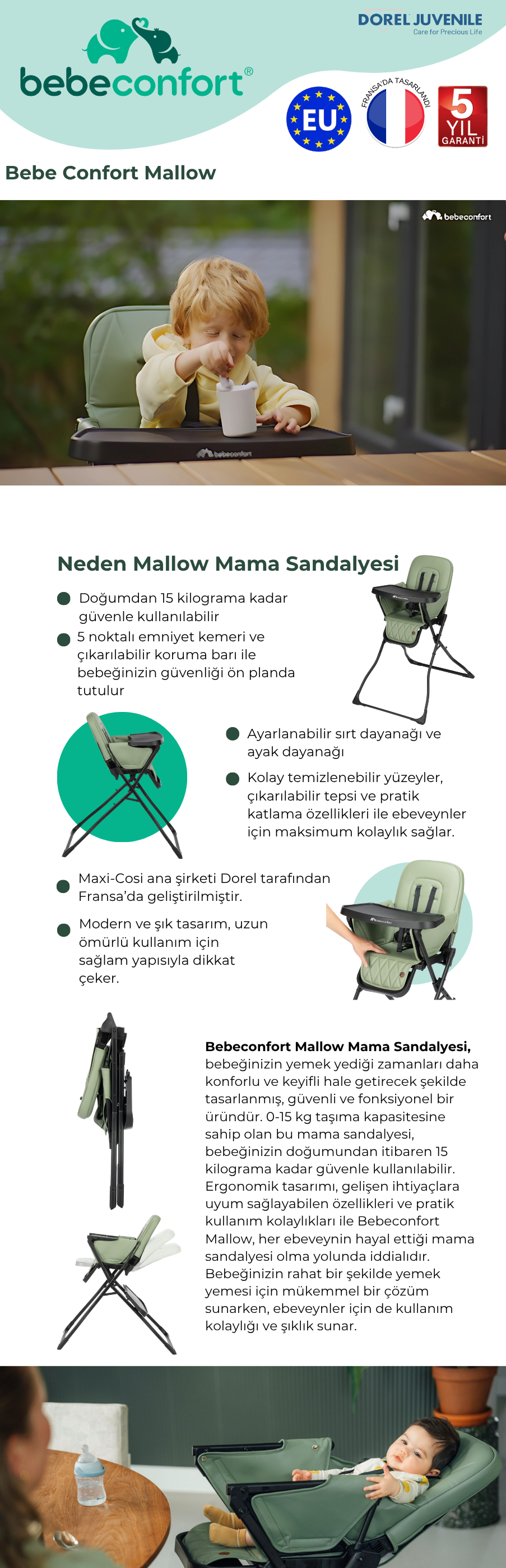 Bebeconfort Mallow Mama Sandalyesi, bebeğinizin yemek yediği zamanları daha konforlu ve keyifli hale getirecek şekilde tasarlanmış, güvenli ve fonksiyonel bir üründür. 0-15 kg taşıma kapasitesine sahip olan bu mama sandalyesi, bebeğinizin doğumundan itibaren 15 kilograma kadar güvenle kullanılabilir. Ergonomik tasarımı, gelişen ihtiyaçlara uyum sağlayabilen özellikleri ve pratik kullanım kolaylıkları ile Bebeconfort Mallow, her ebeveynin hayal ettiği mama sandalyesi olma yolunda iddialıdır. Bebeğinizin rahat bir şekilde yemek yemesi için mükemmel bir çözüm sunarken, ebeveynler için de kullanım kolaylığı ve şıklık sunar.