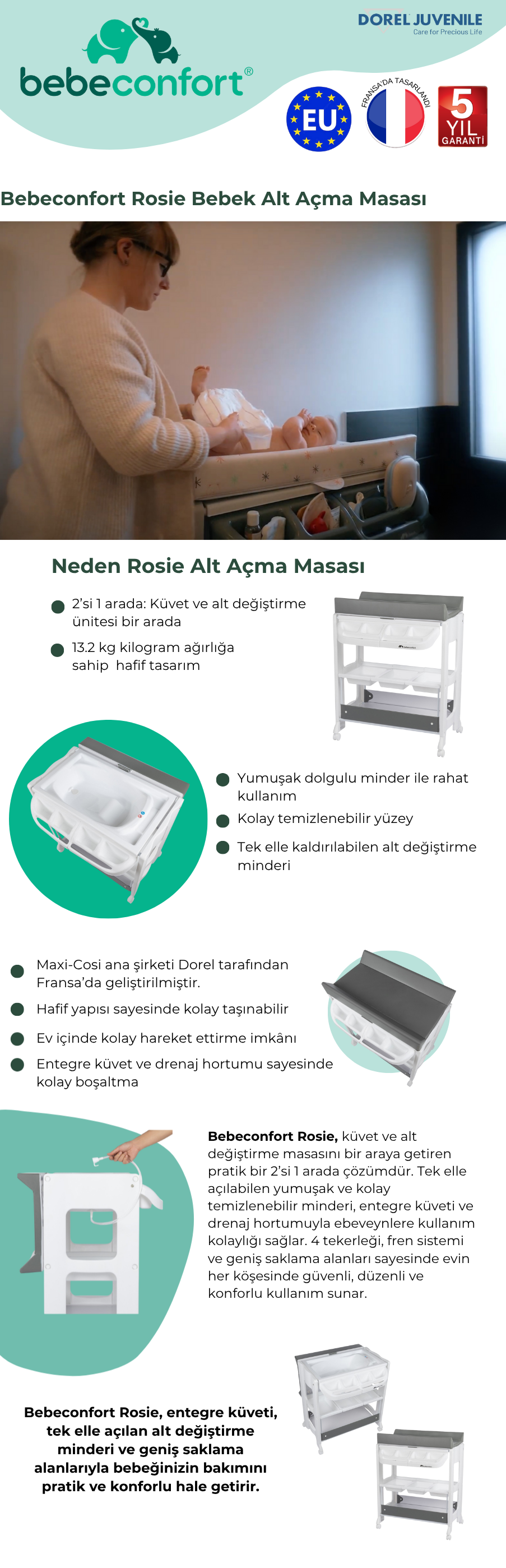 Bebeconfort banyo ve alt değiştirme ünitesi Rosie ile bebeğinizi her şey elinizin altındayken değiştirin ve yıkayın. Tek elle kolayca kaldırılabilen alt değiştirme yatağı sayesinde, ebeveynler eğilmek zorunda kalmadan bebeğe banyo yaptırabilecekler. Rosie ayrıca çoklu saklama bölmeleri ve havlu askılarıyla da oldukça kullanışlı. Ebeveynler, Rosie'yi hareket ettirmeyi kolaylaştıran frenli 4 tekerleği sayesinde bebeğin altını değiştirebilir ve evin her yerinde ona banyo yaptırabilir.