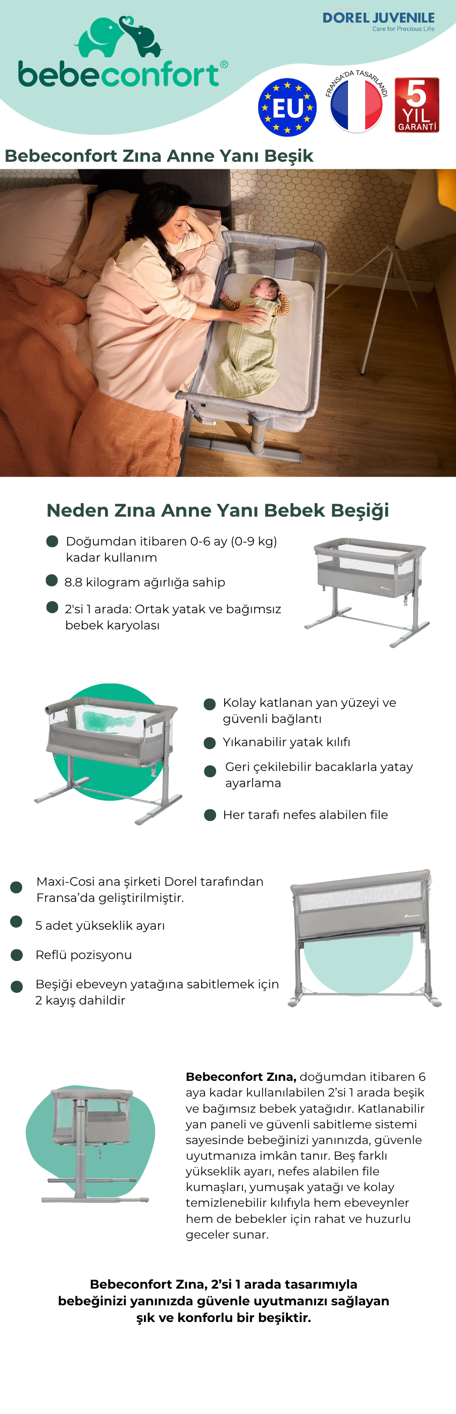 Çoğu ebeveyn yatağına uyum sağlaması için 5 pozisyonlu yükseklik ayarı