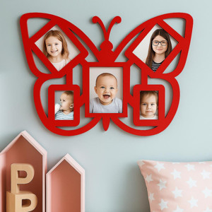 Duvar Fotoğraf Çerçevesi Kelebek Desenli Çocuk Odası Fotoğraf Çerçeve Ahşap 5 Fotoğraf Kapasiteli Pano Kırmızı