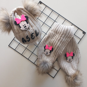 Bebek Kız Çocuk İsimli Bej Beyaz Minnie Çift Ponponlu Atkı Bere Takımı