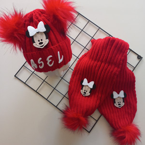 Kız Erkek Unisex Bebek Çocuk Kırmızı Mickey Minnie Mouse Figürlü Ponponlu Atkı Bere Takımı