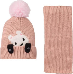 Bebek Kız Çocuk İsimli Bej Fuşya Minnie Çift Ponponlu Atkı Bere Takımı