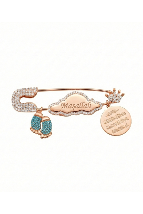 Yeni doğan bebekler ve küçük çocuklar için hem manevi anlamı güçlü hem de şık ve zarif bir tasarım arayanlar için hazırlanan bu bebek yaka iğnesi, Maşallah yazısı ve Nazar Ayeti detayıyla öne çıkar. 925 ayar gümüşten üretilen bu özel parça, geleneksel inançları modern bir tasarımla buluşturur. Turkuaz taşlı nazar detayı, tarih boyunca kötülüklerden korunmayı simgeleyen güçlü bir sembol olarak tasarıma eşlik eder.