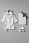 Üç parçadan oluşan set; bornoz, havlu ve ekstra battaniye içerir.
