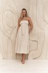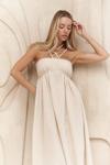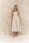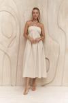 Midi boyu ile hem günlük kullanımda hem de özel günlerde rahatlıkla tercih edilebilen Begonia bej müslin elbise, şıklığı ve konforu bir arada sunar; %100 pamuk materyali sayesinde cildinize nefes aldıran ve gün boyu rahatlık sağlayan bu elbise, tüm yaş gruplarına hitap eder; Sade ve düz deseniyle zamansız bir görünüm kazandıran Begonia bej müslin elbise, her türlü aksesuarla kolayca kombinlenebilir; Dokuma kumaş tipi, dayanıklılığı ve yumuşak dokusuyla öne çıkarken, müslin dokusu hafifliği ve ince yapısıyla yaz ayları için idealdir; Straplez yaka tipi ile omuzları serbest bırakarak feminen bir siluet oluştururken, a; line silueti vücut hatlarını nazikçe sararak zarif bir duruş sağlar; Fermuarlı kapama şekli pratik kullanım sunarken, regular kalıp rahat hareket etme özgürlüğü tanır; Trend ortamlarda dahi stil sahibi görünmenizi sağlayacak bu elb;