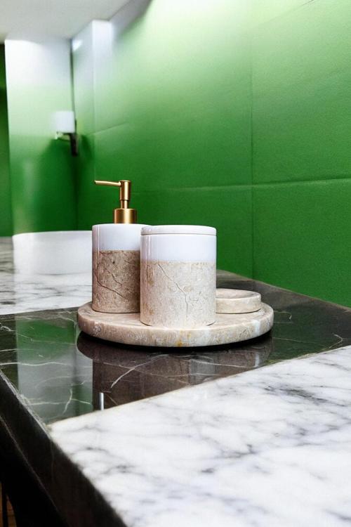 Banyonuzda doğallık ve zarafeti bir araya getiren Bej-Beyaz Mermer 5’li Banyo Seti ile evinizi güzelleştirin!