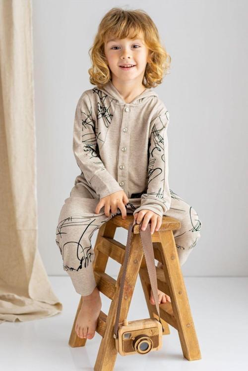Oliven The Kid Bej Ince Triko Geometrik Desenli Kapişonlu Önden Düğmeli Kışlık Unisex Çocuk Tulum Bej