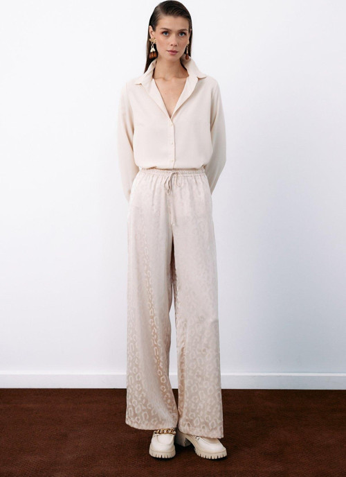 Yüksek ve lastikli bel, salaş model, desenli pantolon.