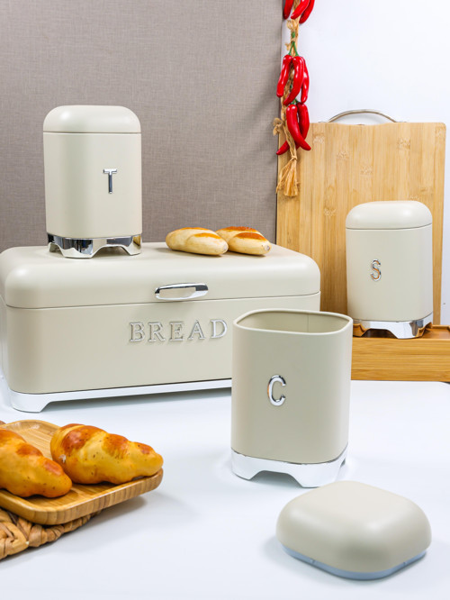 Belariva-Cuisine Ekmeklik & Baharat Saklama Seti Bej | Metal Bread Box + 3’lü Kavanoz Seti