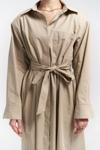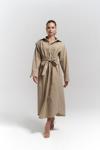 Uzun kollu, yakalı trençkot görünümlü elbise. Manşetleri düğmeli, önü düğme kapamalı.