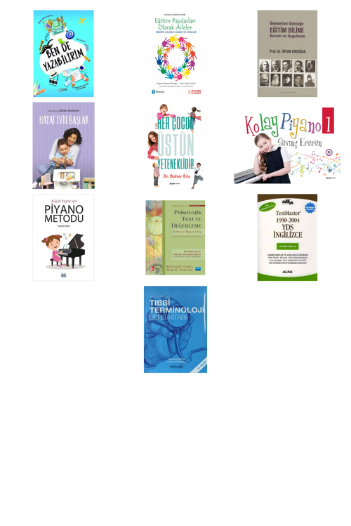 Ben De Yazabilirim - Eğitim Paydaşları Olarak Aileler - Gelenekten Geleceğe Eğitim Bilimi - Hayat Evde Başlar - Her Çocuk Üstün Yeteneklidir - Kolay Piyano 1 - Küçük Yaşlar İçin Piyano Metodu - Psikolojik Test ve Değerleme - TestMaster 1990-2004 Yds İngilizce - Yüksekokullar için Tıbbi Terminoloji Ders Kitabı