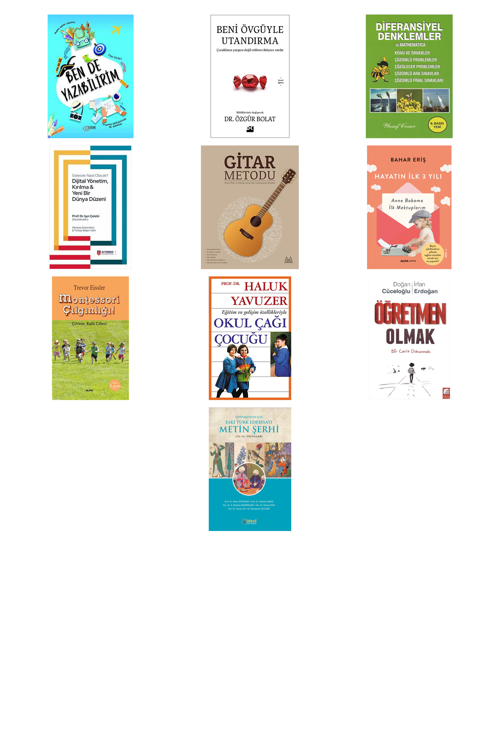 Ben De Yazabilirim - Beni Övgüyle Utandırma - Diferansiyel Denklemler Ve Mathematica - Gelecek Nasıl Olacak? Dijital Yönetim Kırılma ve Yeni Bir Dünya Düzeni - Gitar Metodu - Hayatın İlk Üç Yılı - Montessori Çılgınlığı! - Okul Çağı Çocuğu - Öğretmen Olmak - Üniversiteler İçin Eski Türk Edebiyatı Metin Şerhi