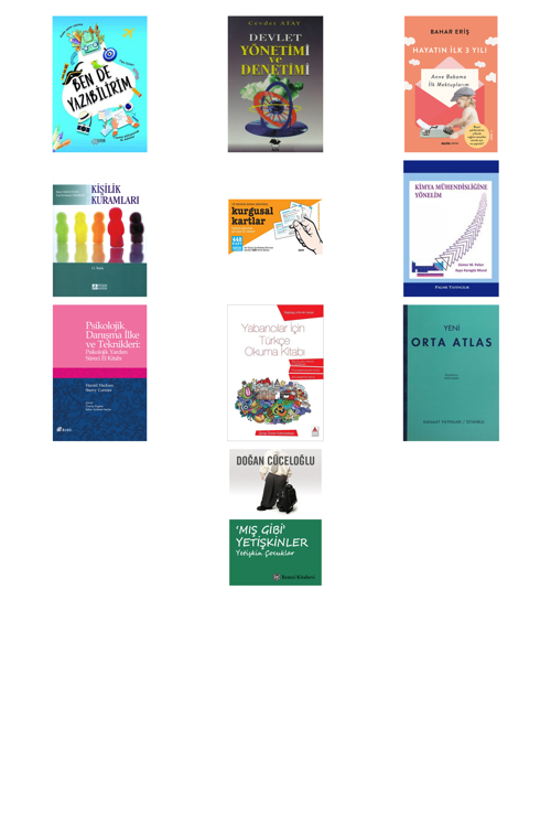 Ben De Yazabilirim - Devlet Yönetimi ve Denetimi - Hayatın İlk Üç Yılı - Kişilik Kuramları - Kurgusal Kartlar - KİMYA MÜHENSİDLİĞİNE YÖNELİM - Psikolojik Danışma İlke ve Teknikleri - Yabancılar İçin Türkçe Okuma Kitabı - Yeni Orta Atlas - ‘Mış Gibi’ Yetişkinler