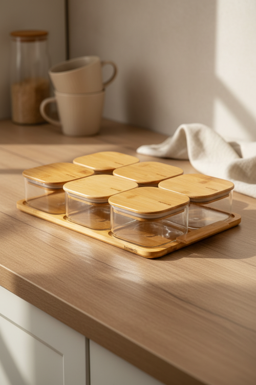 Set, toplam 6 adet bambu kapaklı cam kahvaltılık ve saklama kabından oluşur.