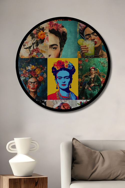 Beta Moda Hub Çerçeve Görünümlü Frida Kahlo Yağlı Boya Görünümlü Dekoratif Ahşap Tablo Yuvarlak Duvar Tablosu