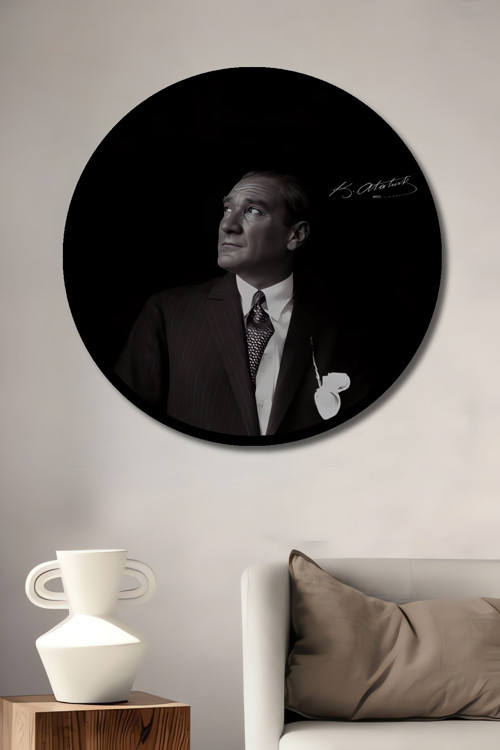 Beta Moda Hub Çerçeve Görünümlü Mustafa Kemal Atatürk İmza Detaylı Siyah Beyaz Görünümlü Ahşap Tablo Yuvarlak
