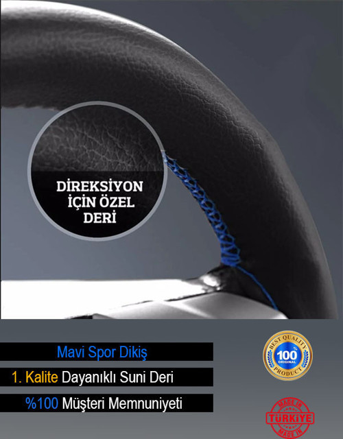 - Yumuşak 1. Kalite malzemeden Yerli Türk Malı olarak Üretilmiş,Yerli Mavi İpli Orijinal Görünümlü Deri Direksiyon Kılıfı.